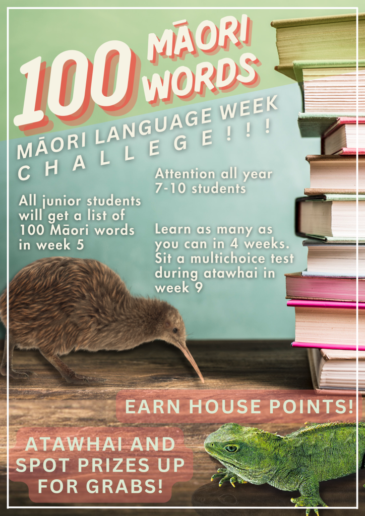 Then during Māori Language week in Week 9 all junior students will sit an online test to collect points for their house. Individual and Atawhai prizes will also be awarded.