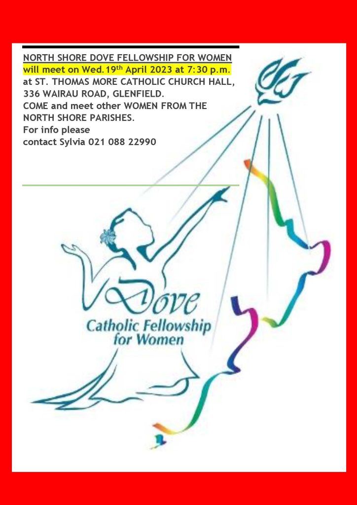 North Shore Dove Fellowship invites women to come together to praise and worship and for prayer ministry at the next gathering on Wednesday, 19 April at 7.30pm at St. Thomas More Church Hall, 336 Wairau Road, Glenfield.