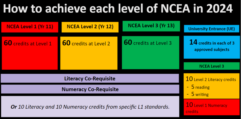 For students who are working towards NCEA in 2024, below is a diagram that illustrates what is required to be awarded each level of NCEA.