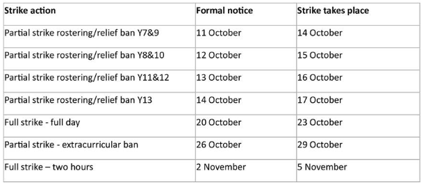 As you will see, this planned industrial action includes Year 7 and 8 students being rostered home on Tuesday 14 October and Wednesday 15 October respectively.