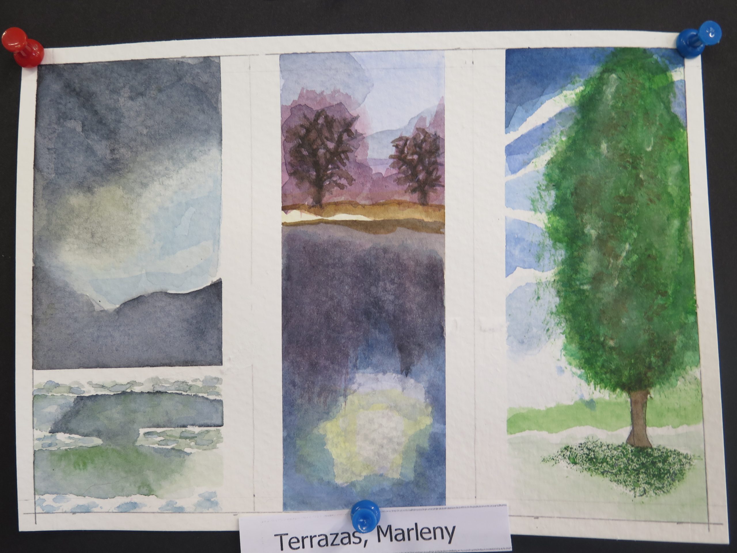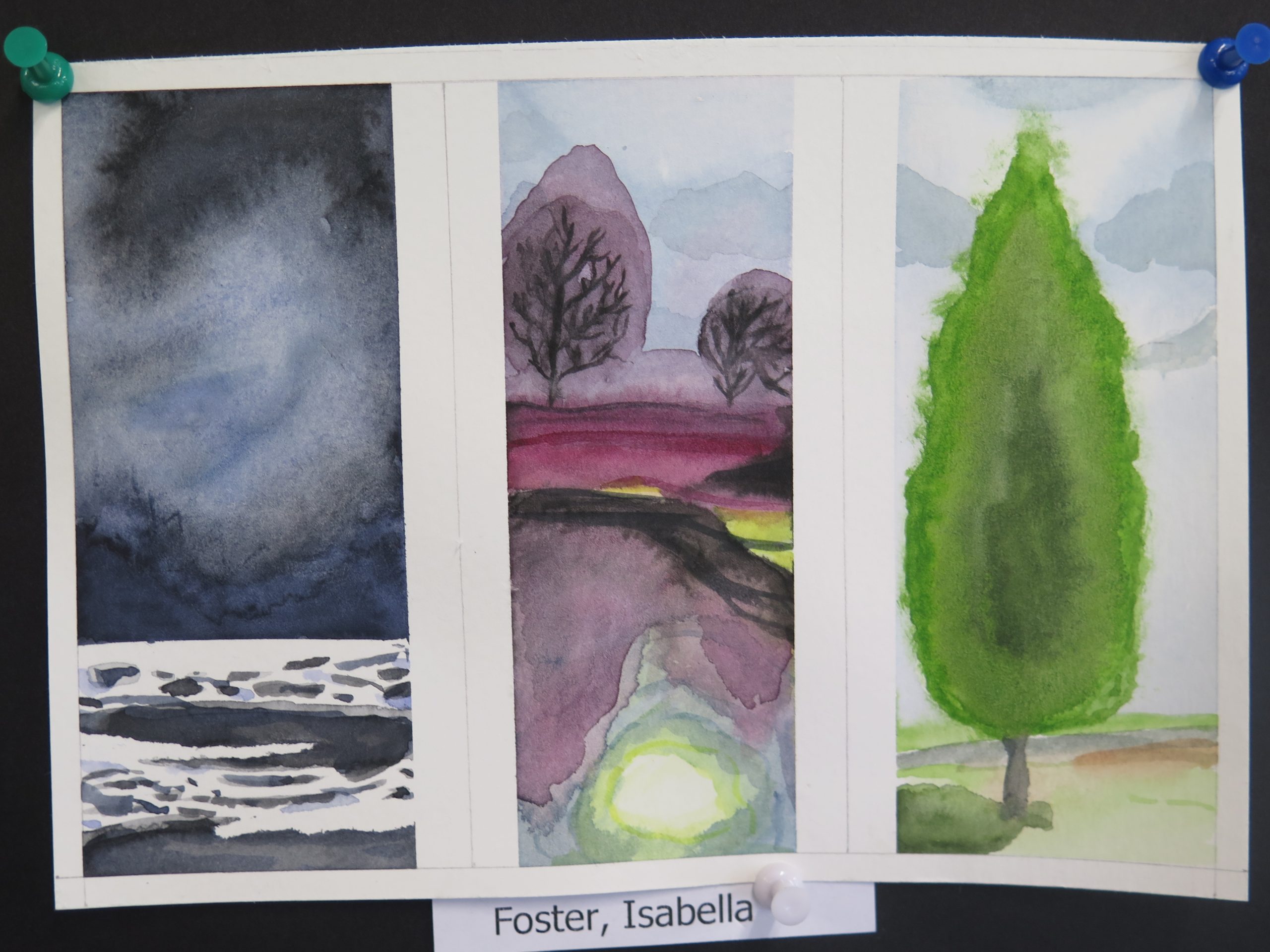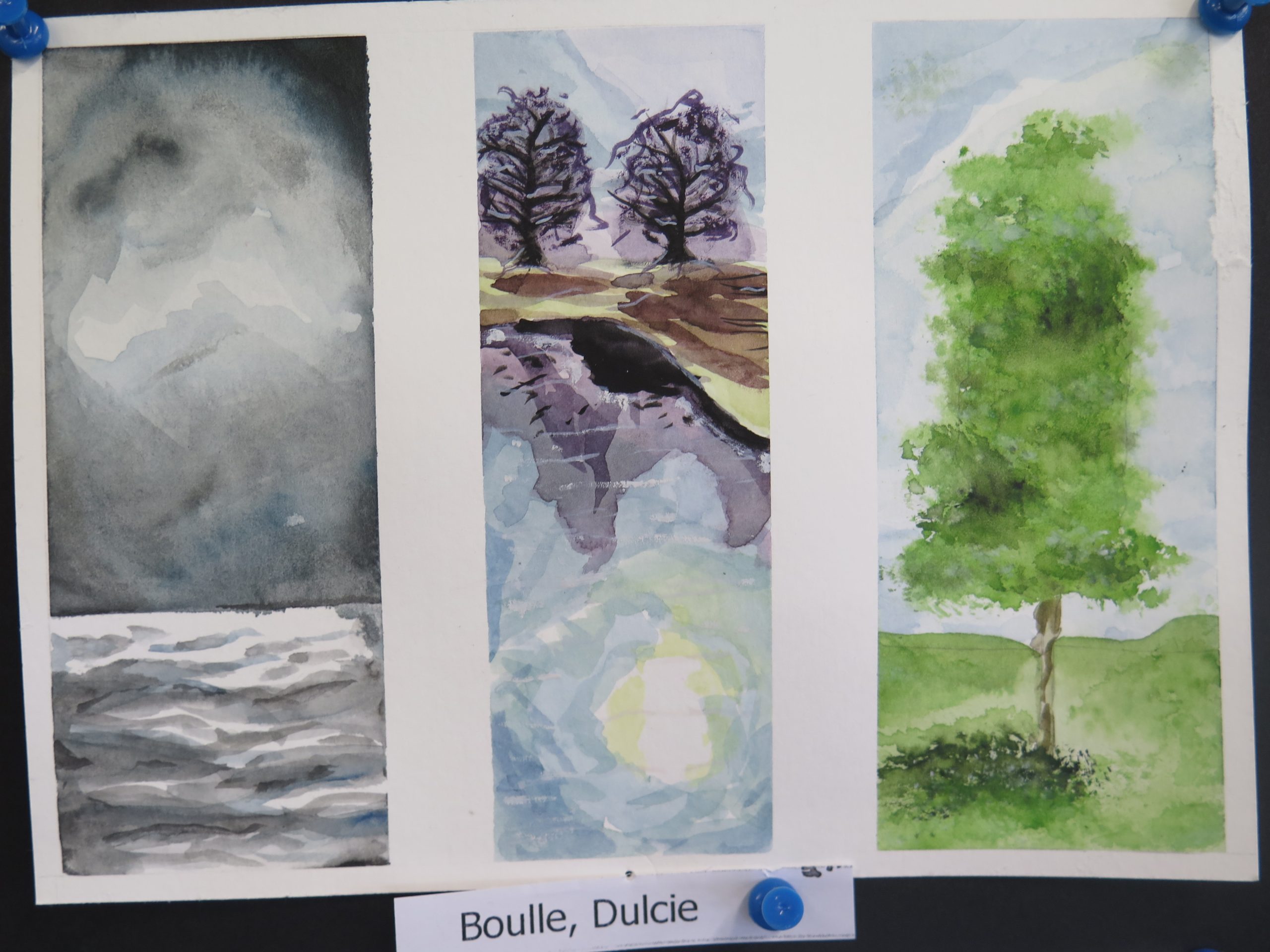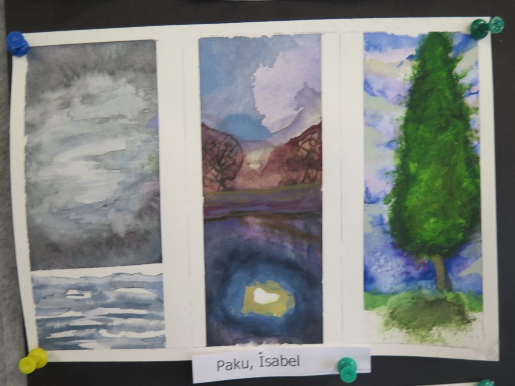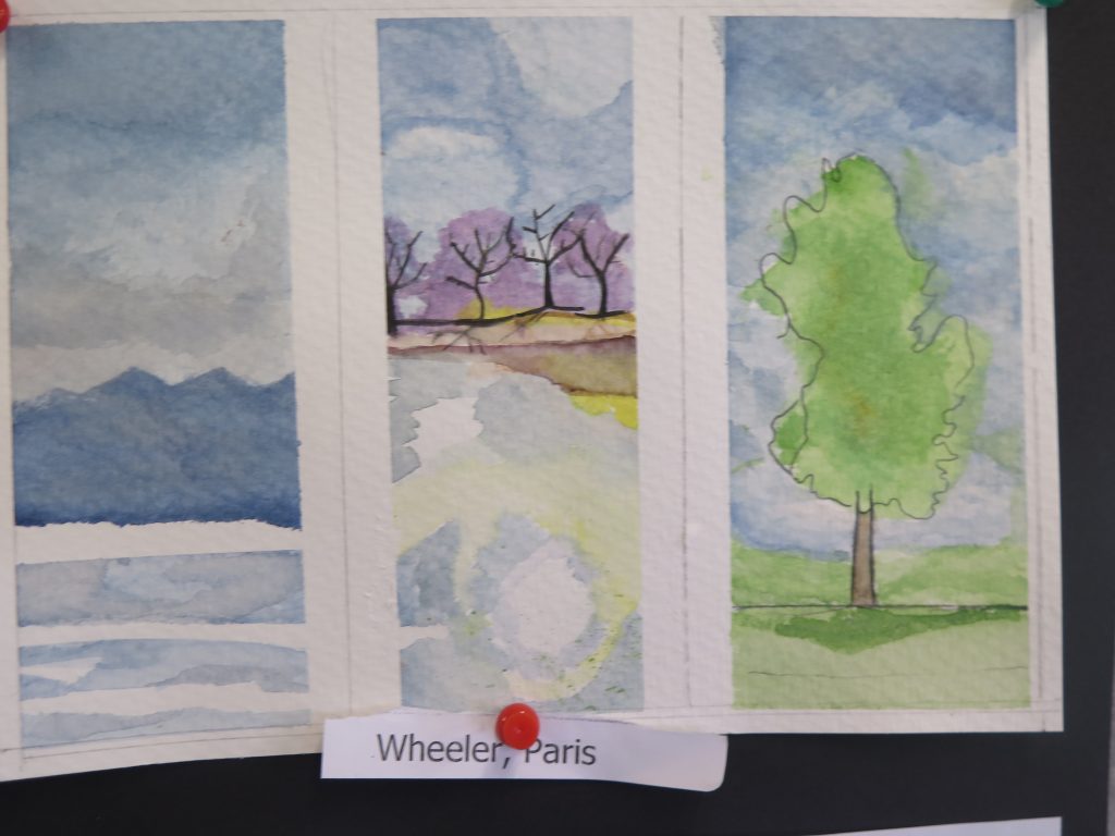 Year 10  Art – watercolour triptych series – are on 300 gram water colour paper and show students’ water colour experiments with different aspects of the landscape, trees, clouds and water reflections.