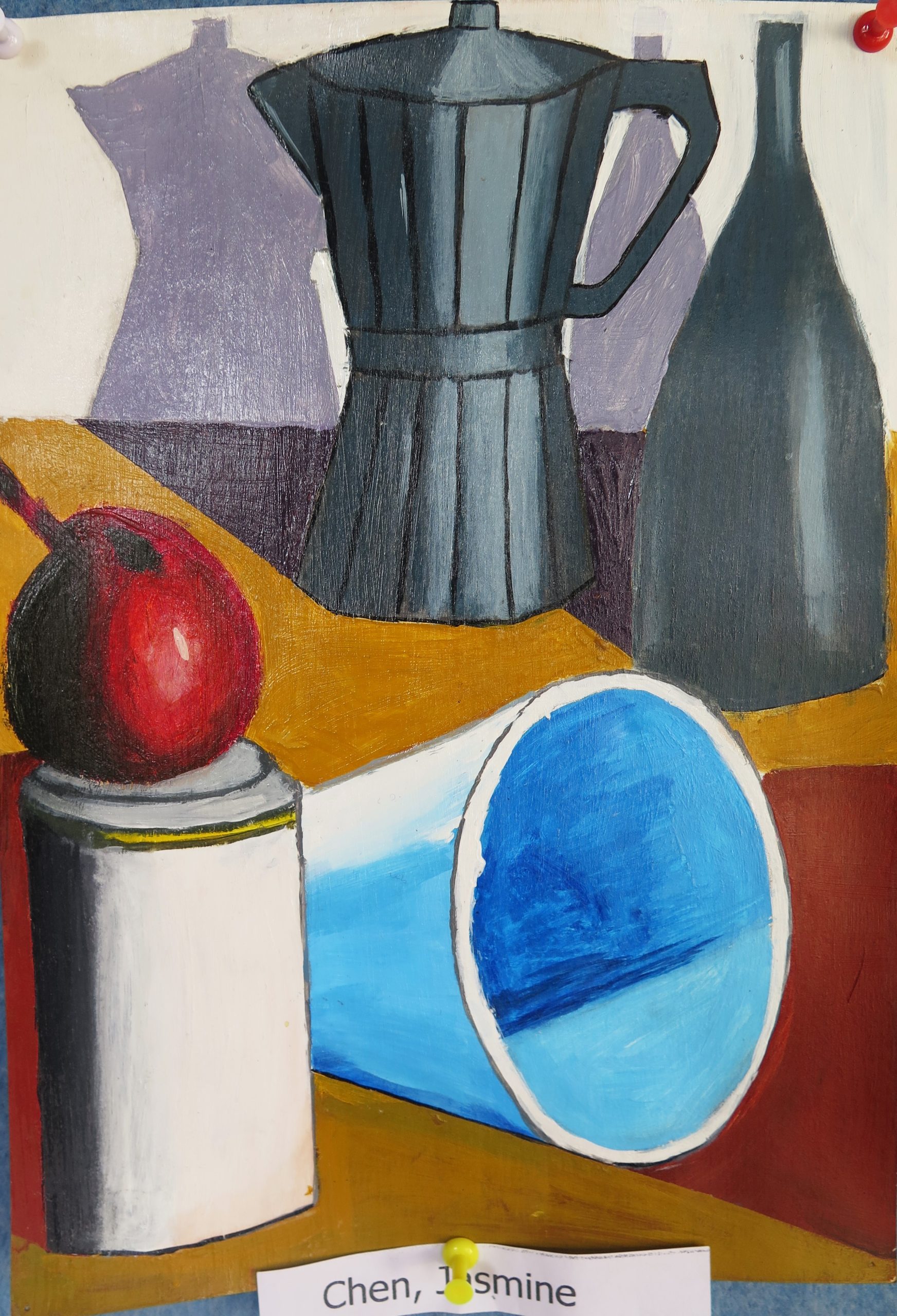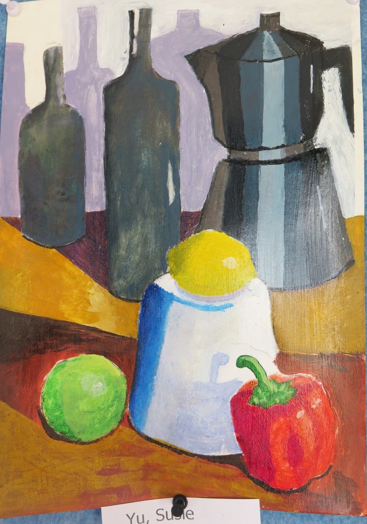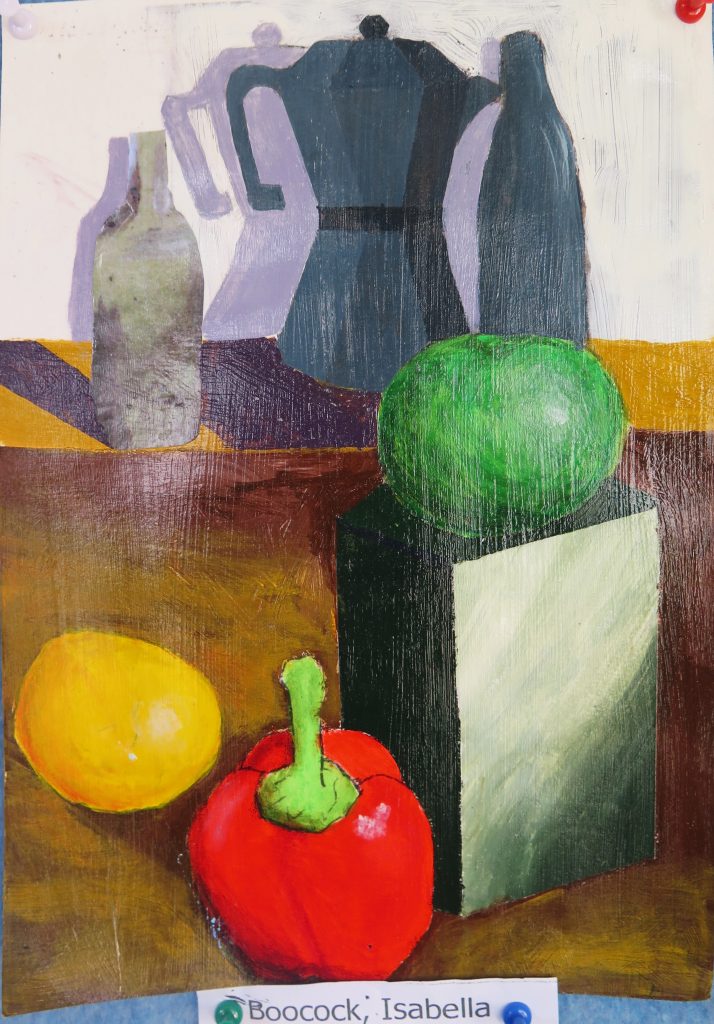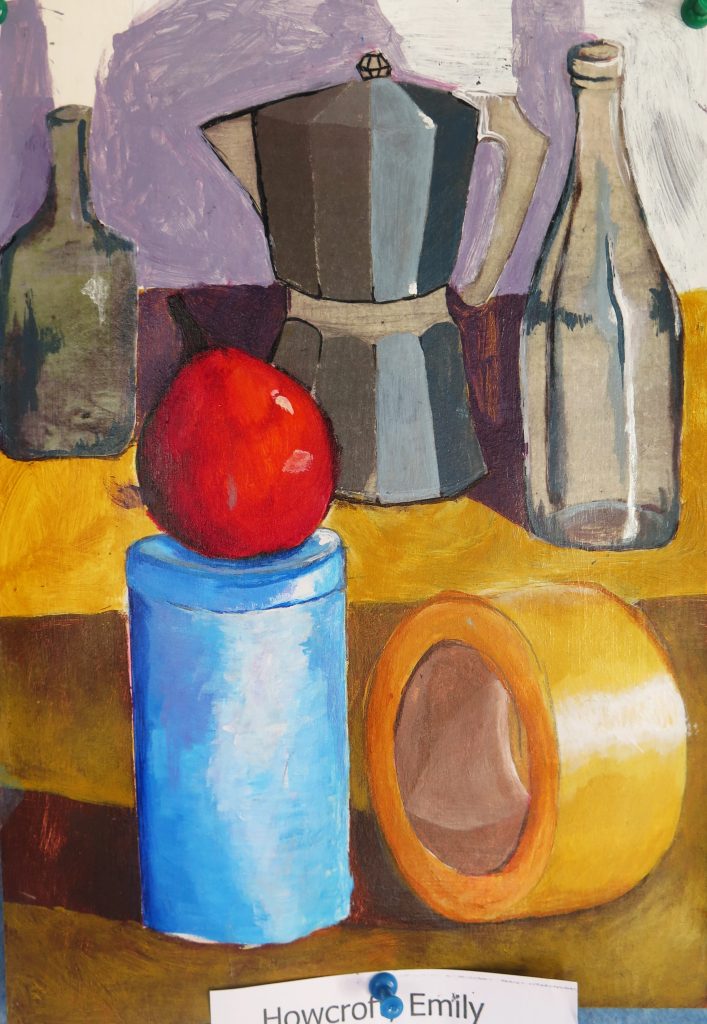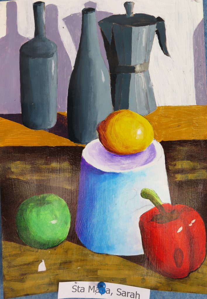 Year 10 Art – still life paintings – are in acrylic paint and are highly varnished.  They show the students’ ability to paint simple geometric forms in a wide range of tones in dramatic lighting and limited colour.