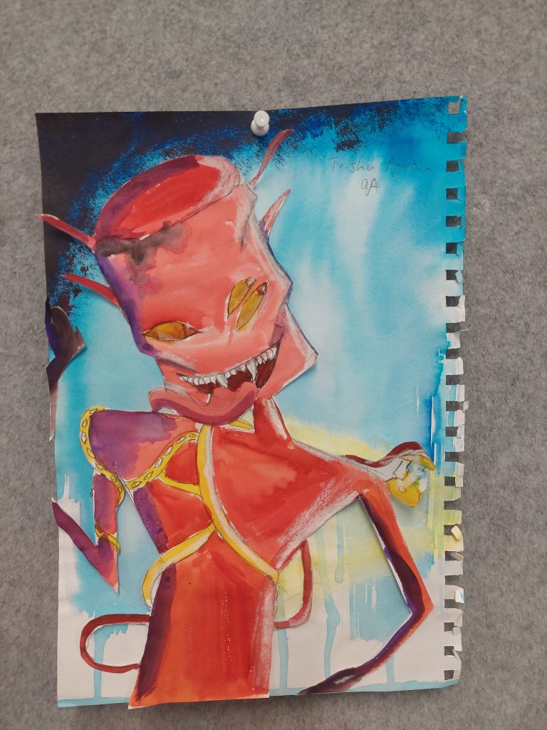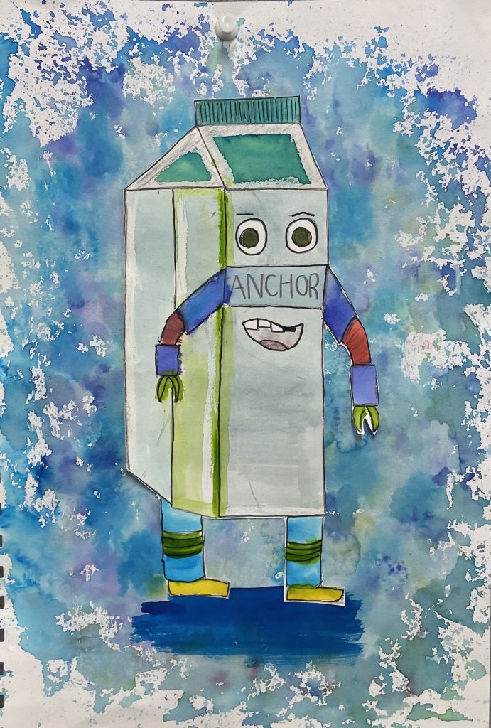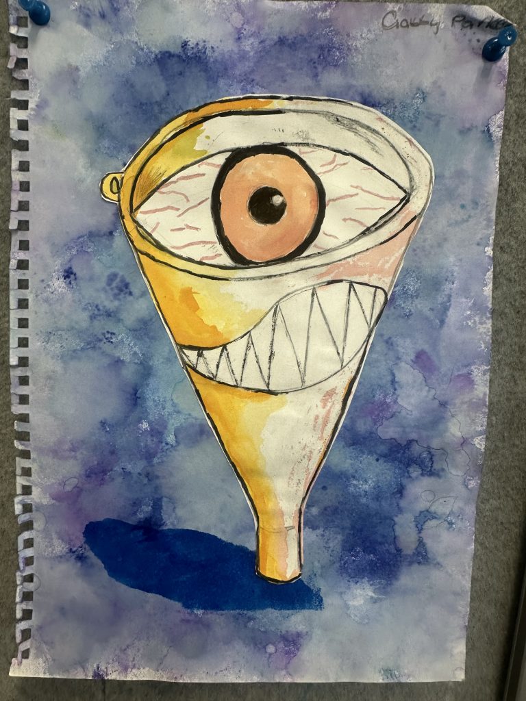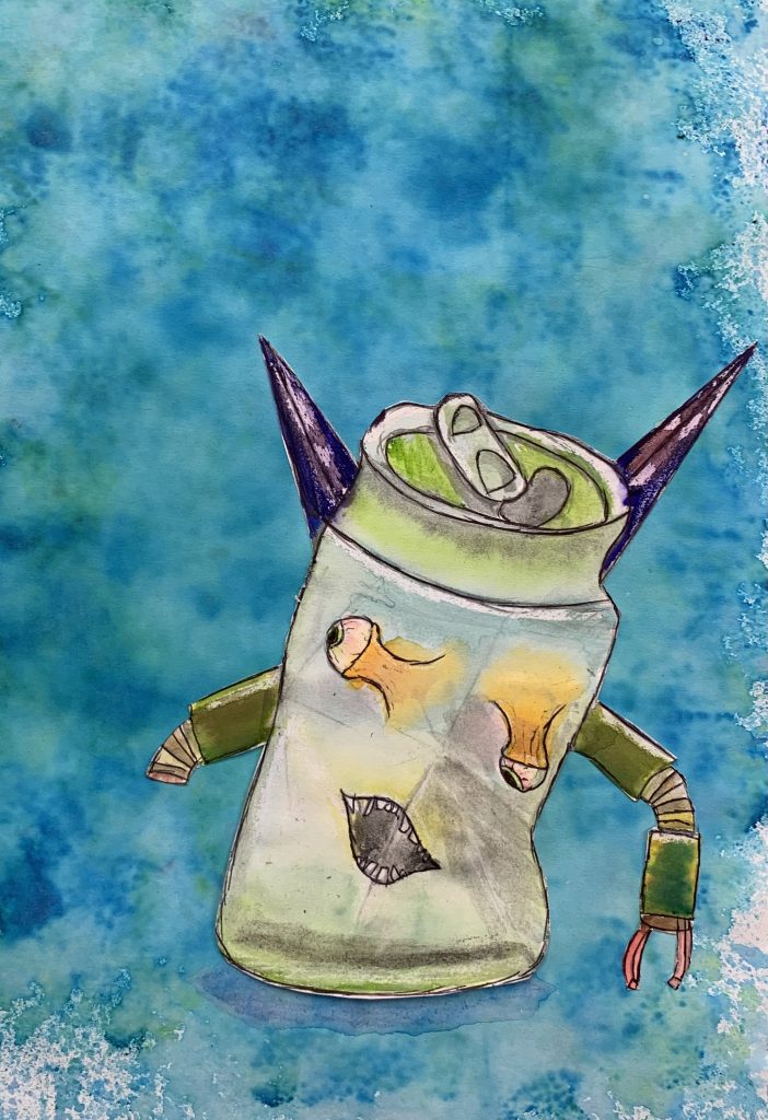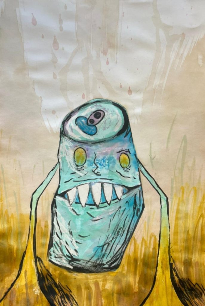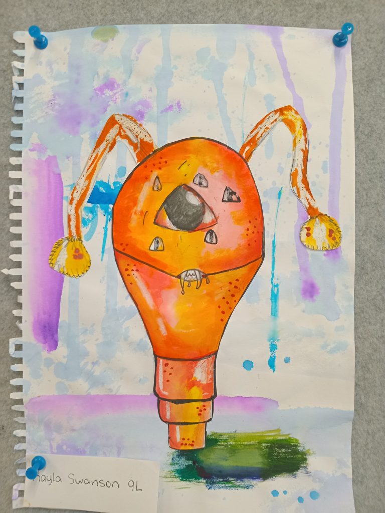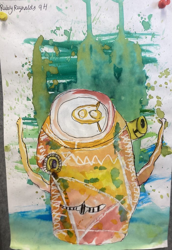 Year 9 Art students were asked to turn a drawing of a piece of packaging or rubbish item into a character. These imaginative ‘futuristic’ figures were based on the work of American artist, Jeff Soto.