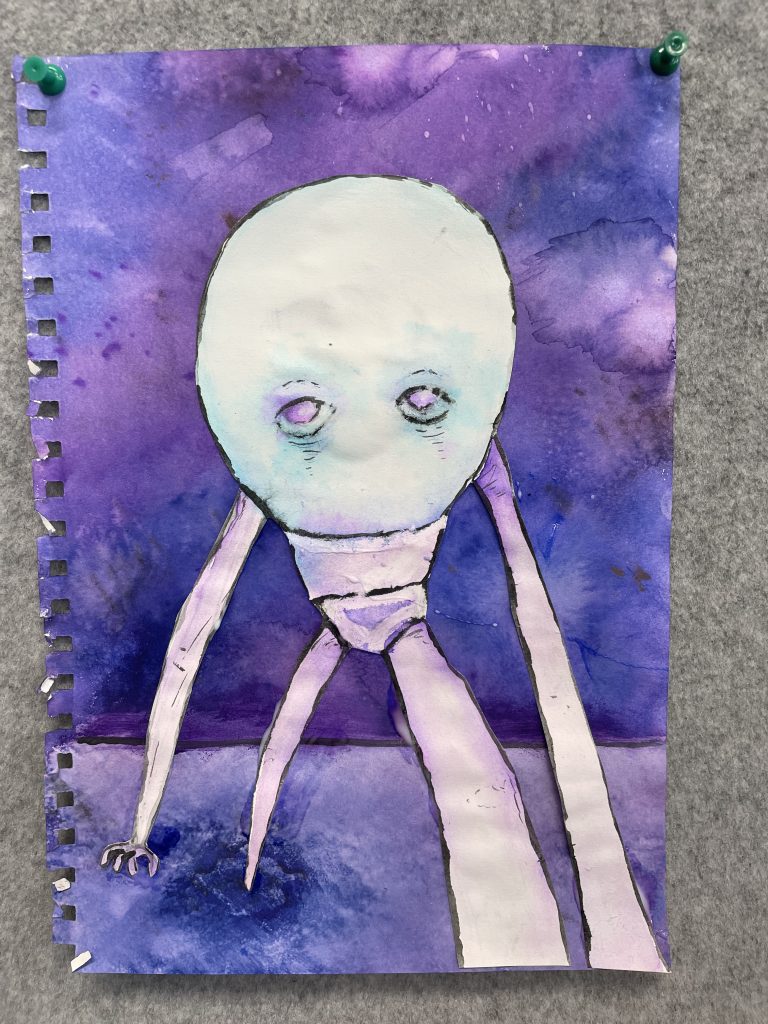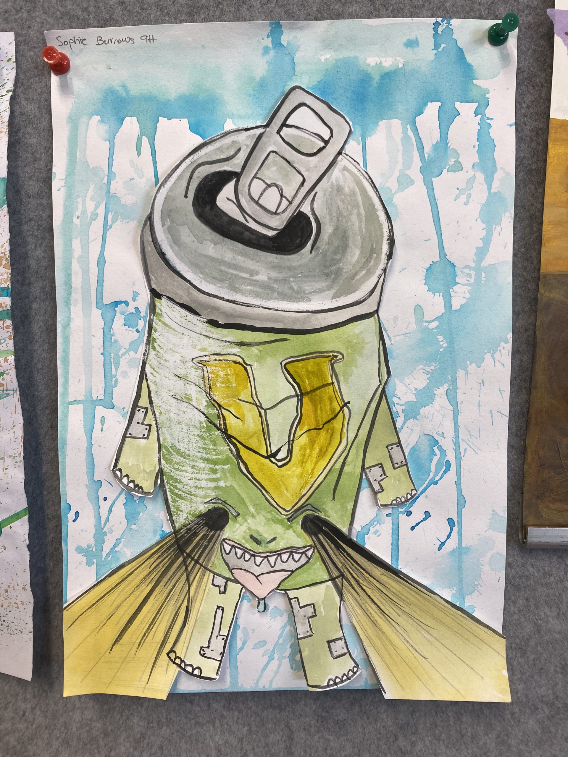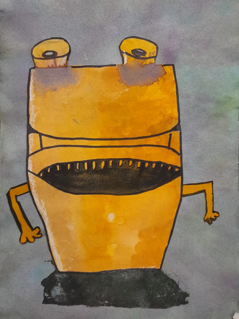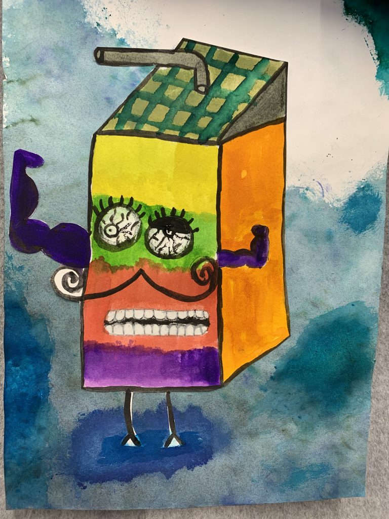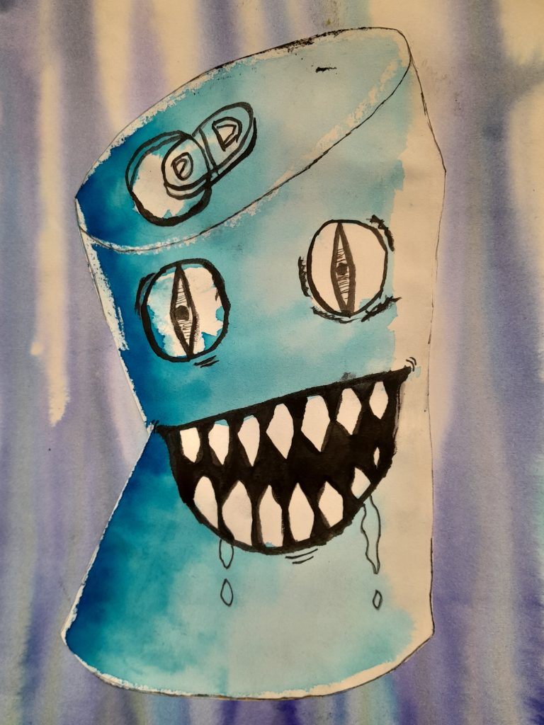 Year 9 Art students were asked to turn a drawing of a piece of packaging or rubbish item into a character. These imaginative ‘futuristic’ figures were based on the work of American artist, Jeff Soto.