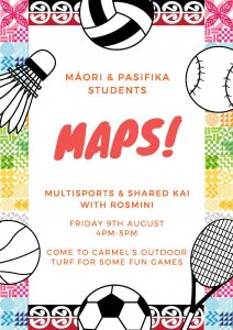 Māori and Pasifika Students, otherwise known as MAPS, is a group where students can socialise, build friendships and have fun. As Polynesian students are a minority at Carmel, MAPS provides a safe and friendly environment for cultural expression. However, this is not to say that non-Polynesian students are excluded from participation – all students with a keen interest in Māori and Pasifika culture are welcome to attend and show their support. Our first event of Term 3 is taking place tomorrow, on Friday 9 August, from 4.00 – 5.00 PM. We invite students, whānau, and friends to come down to Carmel’s outdoor turf to play multisport games and share kai. If you haven’t already and would like to attend, please contact Whaea Tina Peters (Māori Teacher) at [email protected] and complete the Parent Paperwork (online permission slip) for this event. We hope to see you all there!