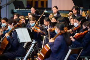 On Tuesday 9 August the Carmel Orchestra performed at the KBB Music festival. The Carmel Orchestra is a non-auditioned Year 7-13 Orchestra and, like all schools in New Zealand, Orchestra rehearsals have been very disrupted this year. Term 1 saw the Orchestra rehearsing the woodwind and brass sections outside the boat shed; definitely not for those who feel the cold. Rehearsals were run separately with the strings and percussion, rehearsing inside and the brass and woodwind outside. These rehearsals were run by senior students with Mrs Brockelbank (Orchestra Director) alternating between them.