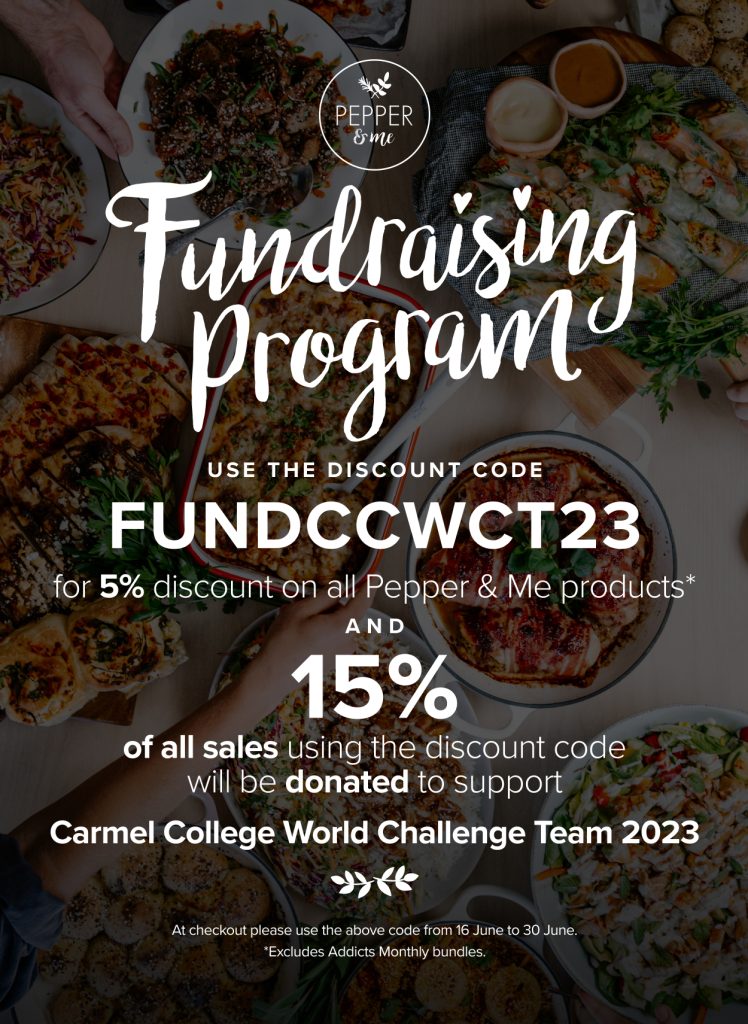 Pepper and Me is a FANTASTIC PRODUCT. You can find PEPPER & ME items in Farro, New World and most other major retailers nationwide. However, by buying the products directly from the company using our Carmel College link, you can save 5% while our World Challenge team will be gifted 15% towards our fundraising.