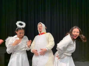 Pictured left to right; Beatrice Belleza, Hannah Houlbrooke and Serena Burke behind the scenes of the Year 13 Drama Play helping play supporting roles and preparing the show.