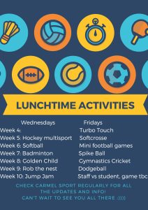 - Thursday 10 March – Netball Umpiring Class at Carmel starts; Year 9-13 Auckland Athletics Championships