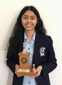 Two of Carmel College’s top chess players were finally united with their trophies this week, after being unable to receive them due to lockdown. The pair took part in the Auckland Girls Chess Championship in July, both of them winning their age groups.Nadia Braganza (Year 11) was the overall champion and under-16 champion (pictured left).