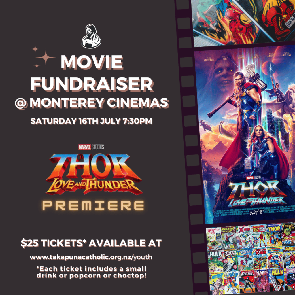 Inviting all movie buffs and MCU fanatics to our very own private screening of Thor – Love and Thunder. The screening will take place during premiere week, so you may be the first among your mates to see this one. So come along with your whānau, friends, and co-workers for a fun movie night fundraiser at Monterey Cinemas. All money collected will go towards St Joseph’s Parish Youth Ministry. This is an evening you wouldn’t want to miss out on. Get your tickets TODAY!!
