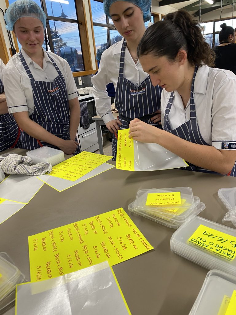 On 5 June, members of the Carmel Young Vinnies and the Rosmini Young Vinnies came together at Carmel to participate in Travelling Pots.  This is an evening in which we prepare, cook and package meals to be distributed to individuals and families who seek food assistance from Vinnie’s food bank.  These individuals or families do not necessarily have the resources to create balanced meals, so this event truly makes a difference to people.  With the help of our youth coordinator, Savi, we cooked and packaged 81 mince and pasta meals.