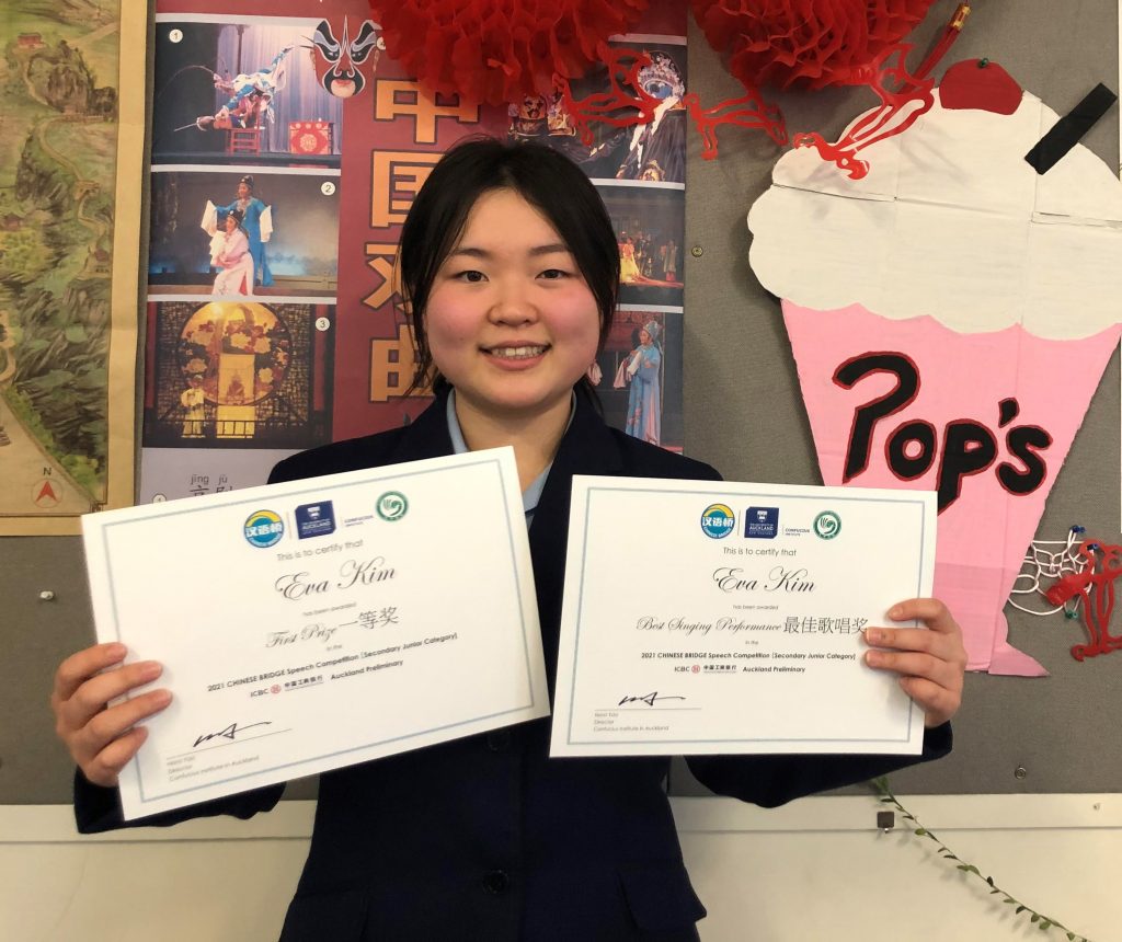 Our Year 10 Chinese class attended the Chinese Bridge Speech Competition 2021. Eva Kim won the First prize and the Best Singing Performance in the Junior Category in the Auckland region (pictured above). She then performed well in the National Final on 8 August and won the Outstanding Performance prize.