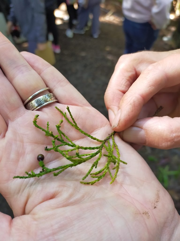 While in the bush we noticed very large, mature pūriri trees and lots of other species such as taraire, kowhai, karaka, tawa and tōtara as well as quite a lot of kahikatea. We were specifically looking at the different species and where they existed in the different layers of the forest.