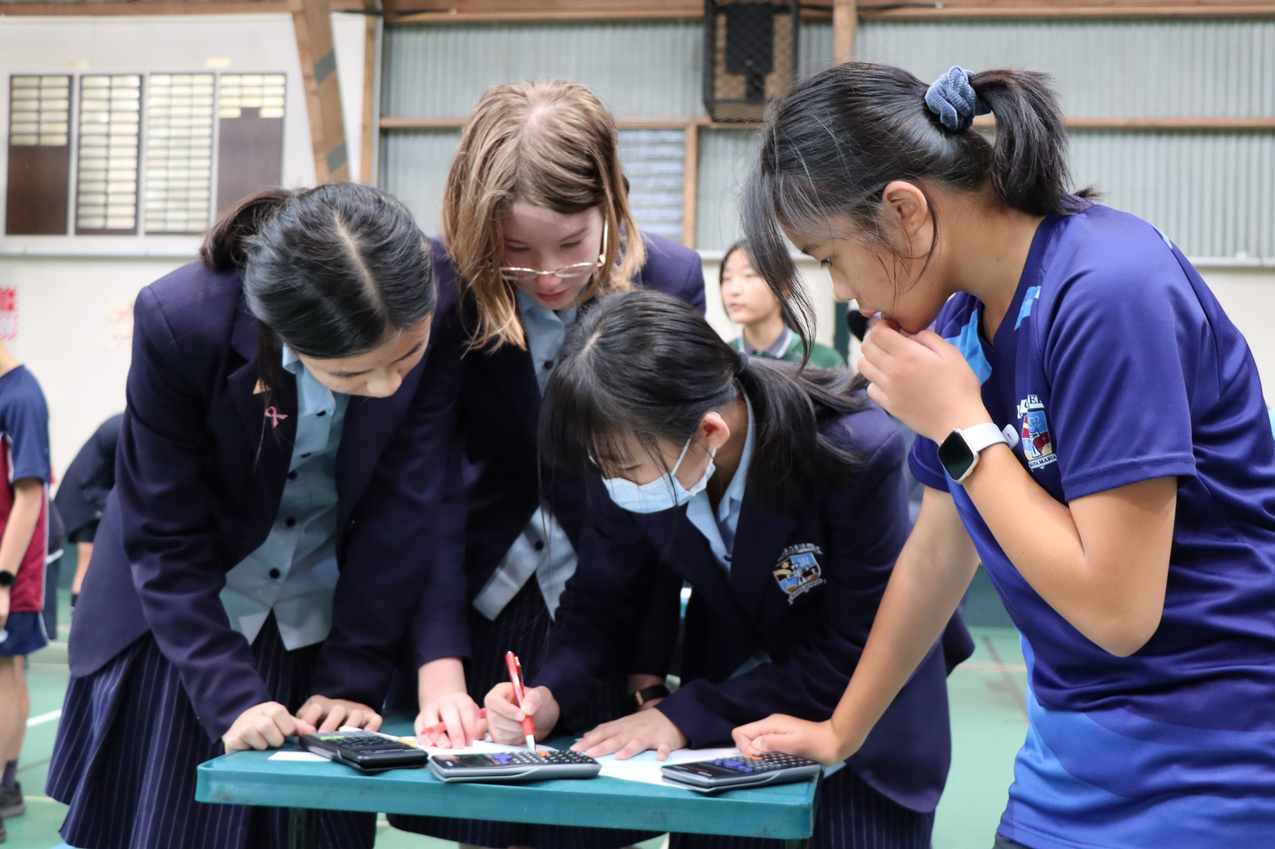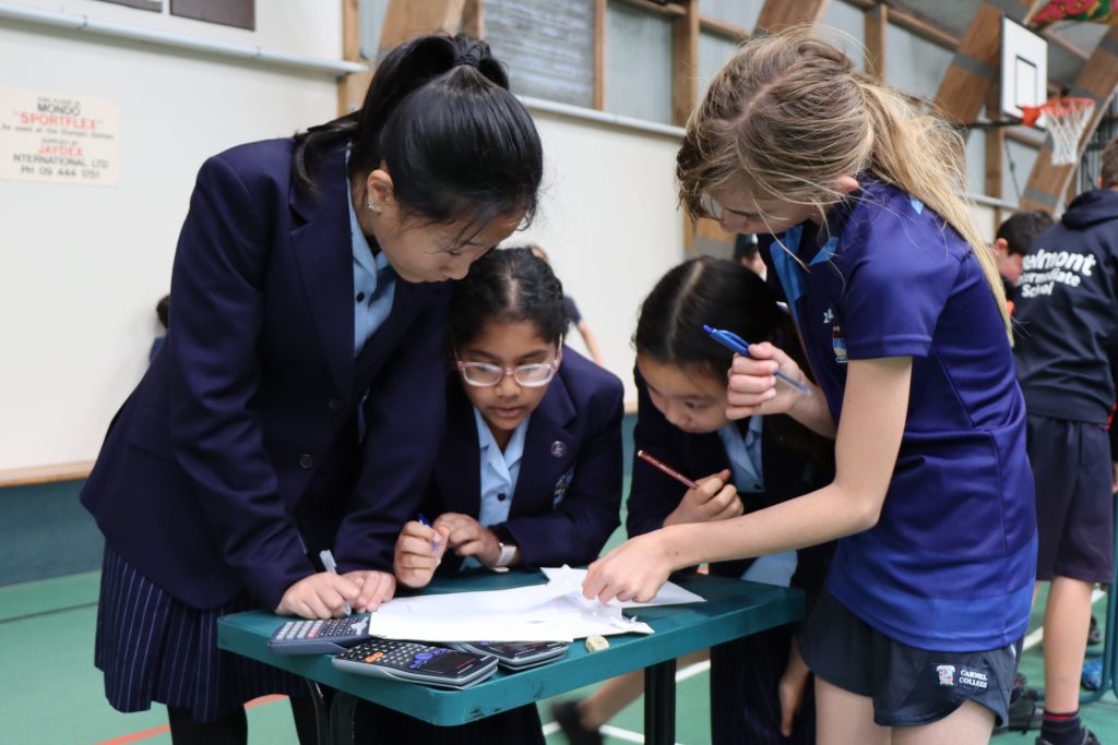 Mathex took place in the Northcross Intermediate School gym. It was a marvellous, fast-paced math competition where teams of Year 7 and Year 8 students from many North Shore schools competed to finish 20 questions in 30 minutes. Carmel had eight teams competing, 32 girls altogether.